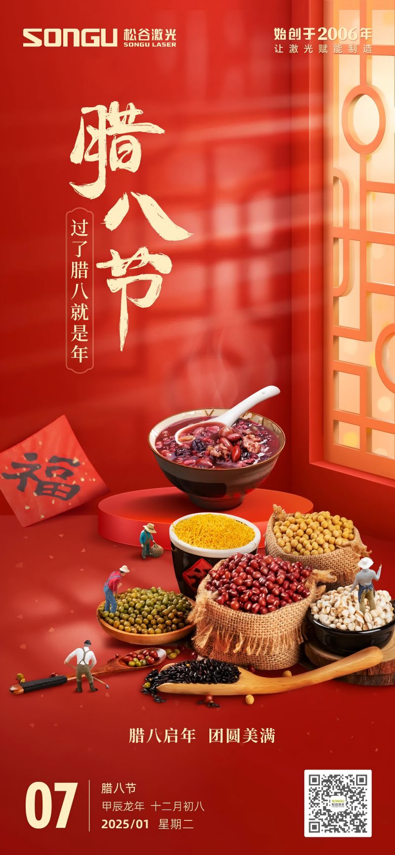 随(sui)着(zhe)冬(dong)日的脚(jiao)步渐行渐(jian)深,我们迎来了(le)传统而(er)温(wen)馨的腊八节。在这个充满节日氛围的(de)时刻,松谷激光科技向全体员工、合作伙伴以(yi)及一直以来支持我们的(de)朋友们(men)致以最(zui)诚(cheng)挚的节(jie)日祝福和最深切的关怀!