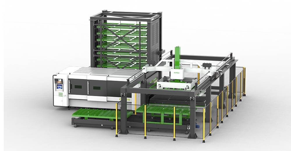 在松谷(gu)激光切割机的切割平(ping)台上搭载 HyStore 系列自(zi)动(dong)上下料及(ji)仓储系统,通(tong)过软件控制系统进行串联控制,实现无(wu)人值(zhi)守的(de)全自动(dong)化(hua)智能激光切割生产线;